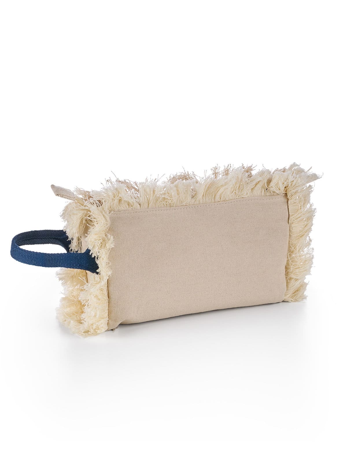 Pochette con frange decorative, chiusura a zip, fodera interna e maniglia laterale.