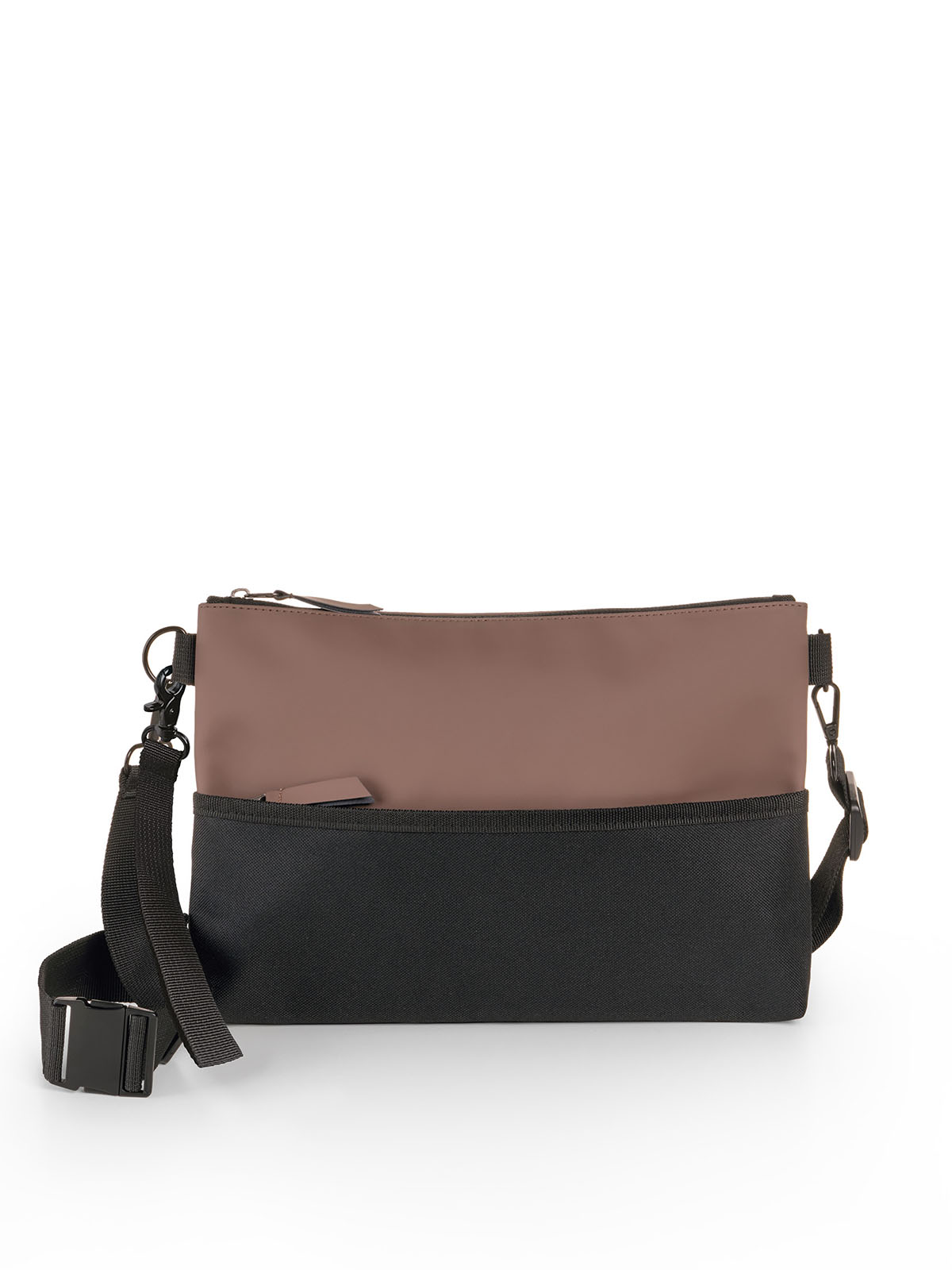 Borsa con tracolla regolabile e staccabile, utilizzabile come beauty o portadocumenti con laccio, rimuovendo la tracolla. Tasca frontale con zip e piccola tasca interna.
