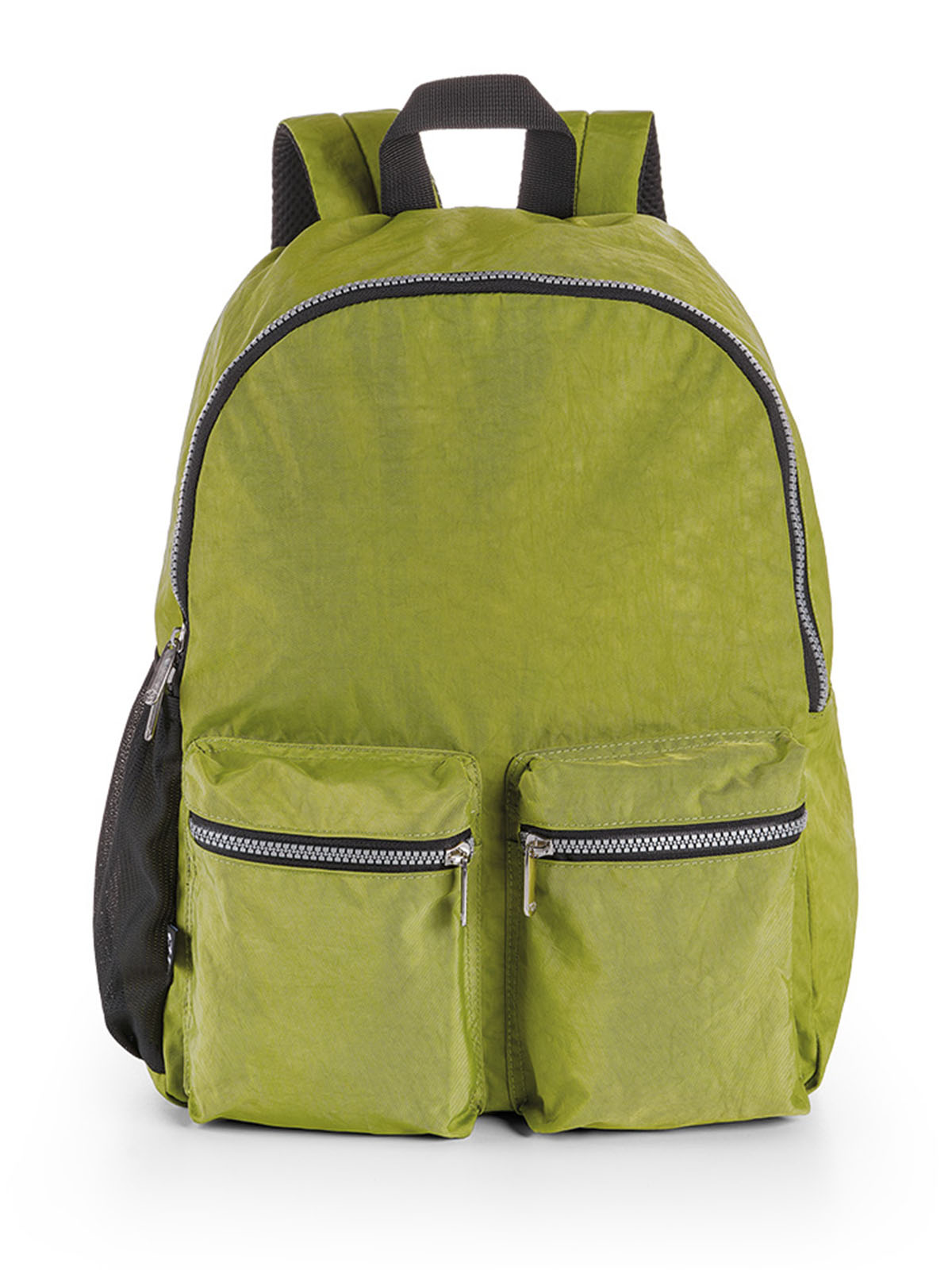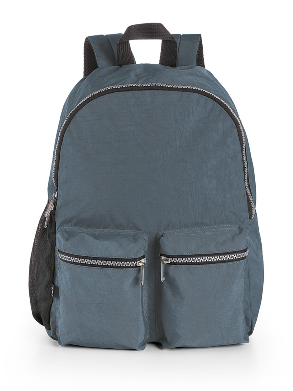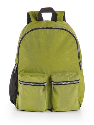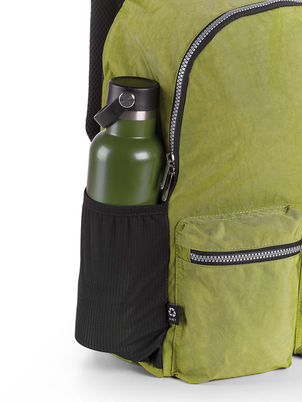 Zaino con vano principale capiente e doppia tasca esterna frontale. Retro imbottito con fascia trolley e spallacci imbottiti. Tasca portaborraccia laterale in rete a contrasto.